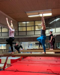 Aikuisten telinevoimisteluryhmässä voi jokainen harjoitella oman taitotasonsa mukaan eikä aiempaa telinevoimistelutaustaa vaadita. Harjoitukset aloitetaan lajinomaisella verryttelyllä ja päätetään lajinomaiseen venyttelyyn. Aloittelijat pääsevät tutustumaan mm. kuperkeikkoihin, kärrynpyörään, käsilläseisontaan ja kieppiin. Aiemmin harrastaneille tarjotaan mahdollisuus palauttaa mieliinsä edellä mainittujen lisäksi mm. arabialaista, puolivolttia ja kippiä. Koska ryhmä on sekaryhmä, kokeilemme kaikkia naisten ja miesten telineitä. Harjoituksiin kuuluu myös olennaisilta osin voima- ja liikkuvuusharjoitteet. RYHMÄSSÄ EI OLE YLÄIKÄRAJAA!